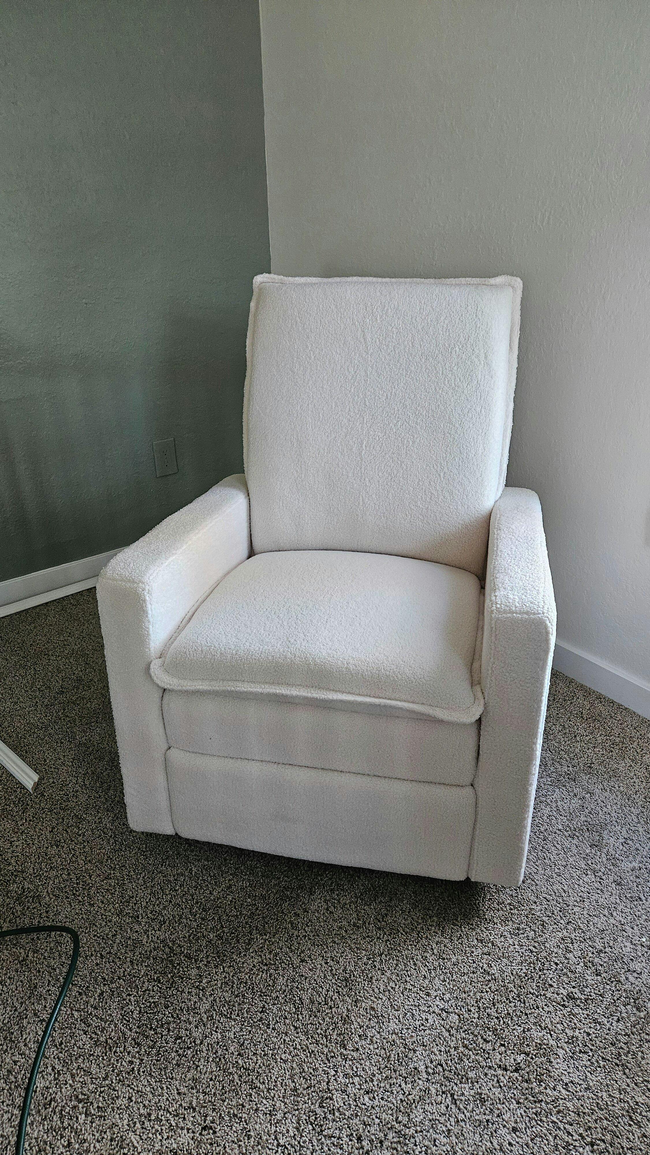 We have had this chair for a couple months and absolutely love it! It’s adorable in our nursery and can’t wait for baby boy to be here to use it with him. It reclines back pretty far and comfy; closing it doesn’t require a bit of force but I I don’t have any issue with it