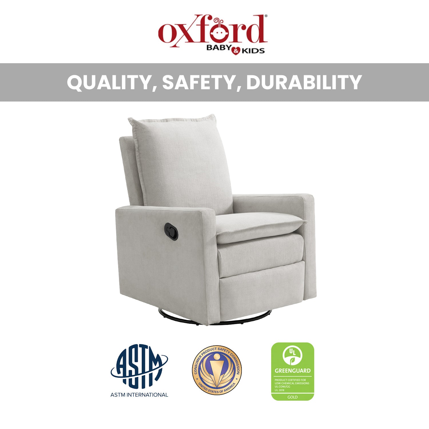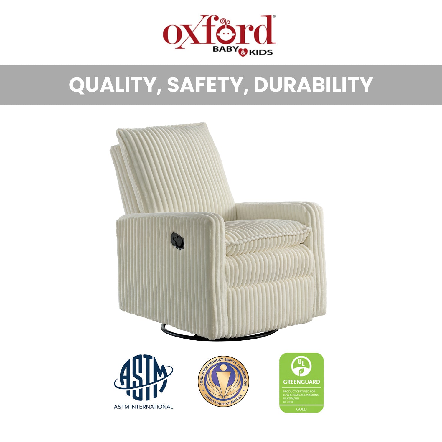 Create a warm and welcoming nursery with the Uptown Swivel Rocker & Recliner. With its sleek, modern design, the plush Uptown Swivel Rocker & Recliner boasts luxury and comfort for ultimate relaxation and quality time with your baby. The Uptown Swivel Rocker & Recliner features quiet metal mechanisms that offer a full range of motion – a calming rocking motion and a gentle 360-degree swivel. Designed for comfort, the Uptown Swivel Rocker & Recliner is comfortably cushioned throughout to ensure lifelong comfort and includes a recline option. The Uptown Swivel Rocker & Recliner is perfect for soothing both parents and baby and stylish enough to be transitioned to any room in the home.