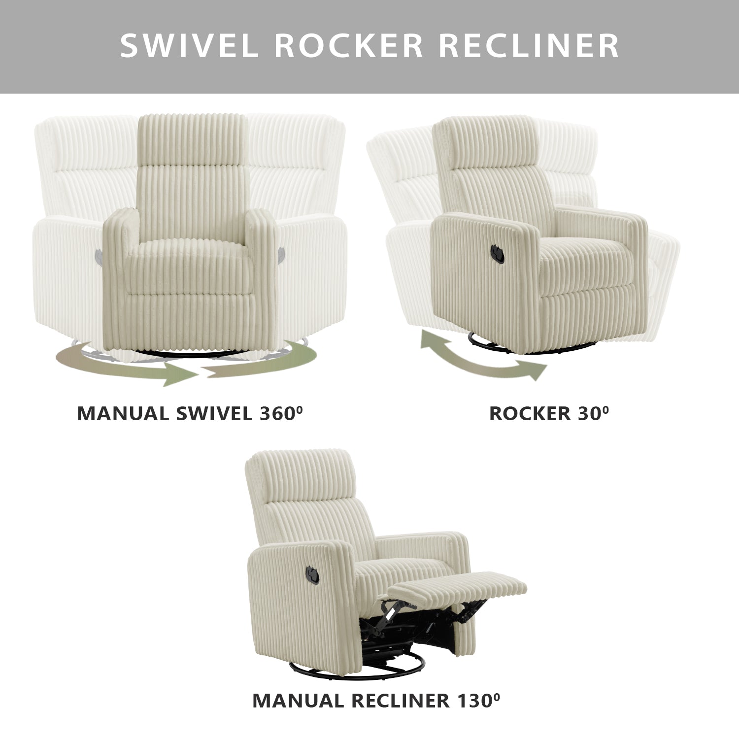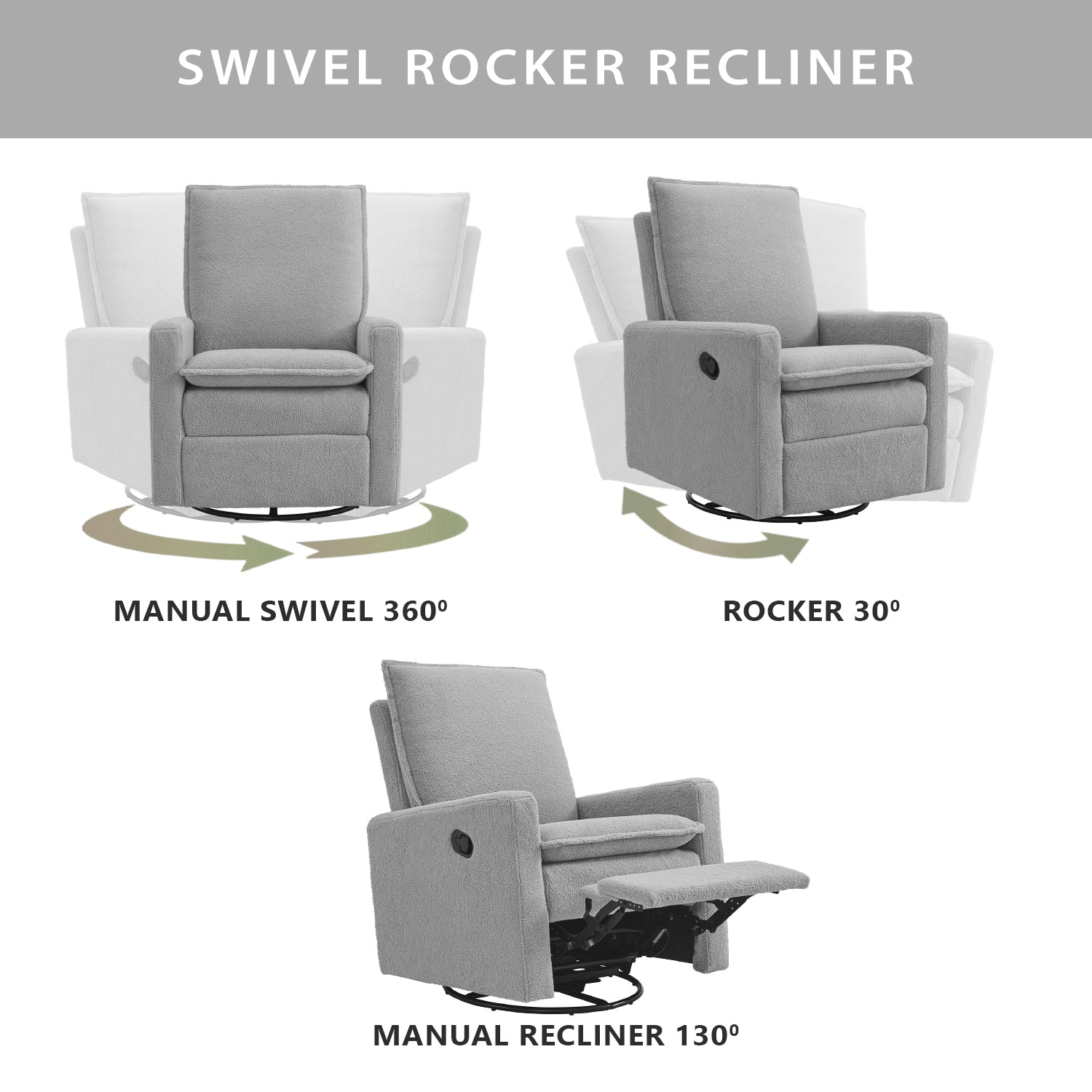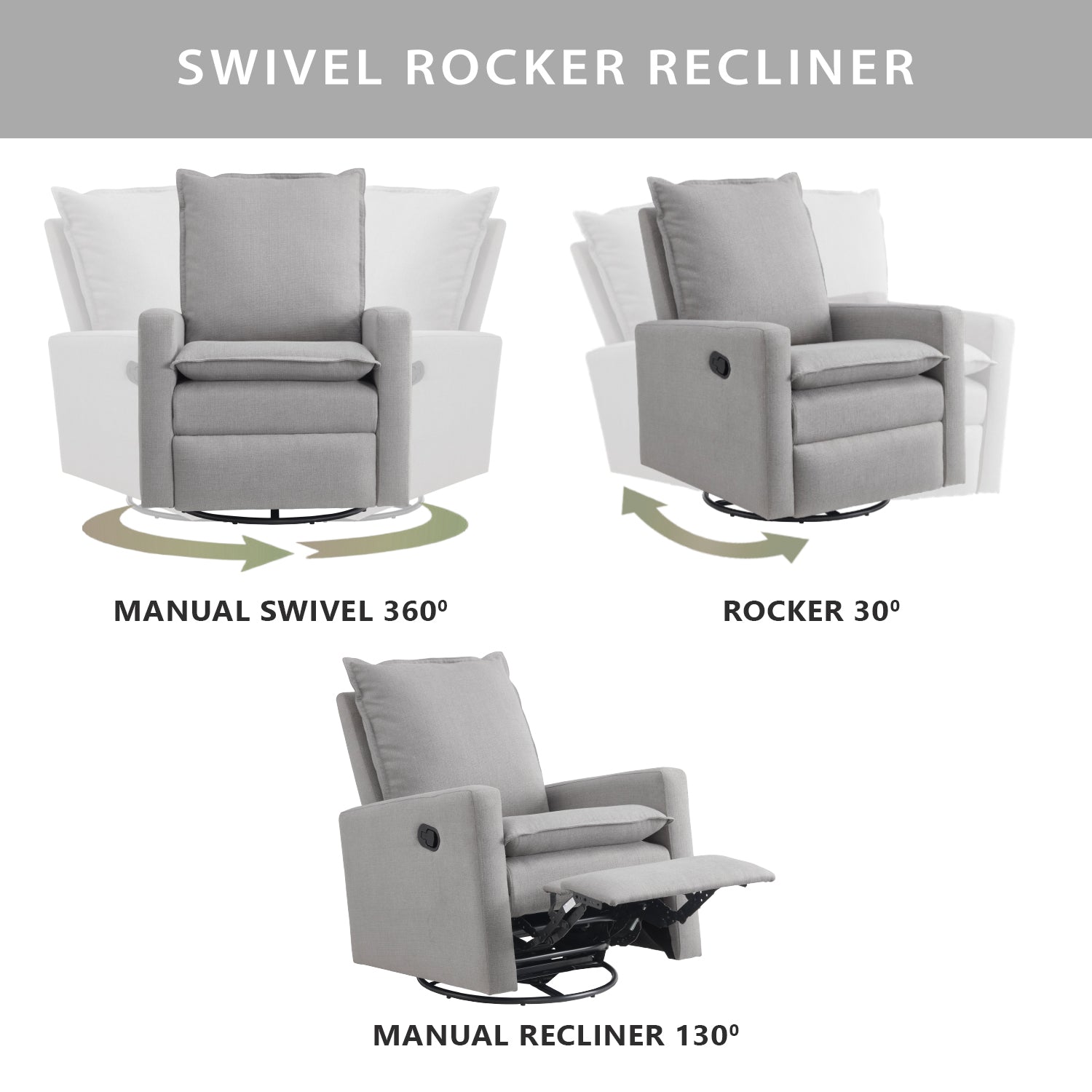 Create a warm and welcoming nursery with the Uptown Swivel Rocker & Recliner. With its sleek, modern design, the plush Uptown Swivel Rocker & Recliner boasts luxury and comfort for ultimate relaxation and quality time with your baby. The Uptown Swivel Rocker & Recliner features quiet metal mechanisms that offer a full range of motion – a calming rocking motion and a gentle 360-degree swivel. Designed for comfort, the Uptown Swivel Rocker & Recliner is comfortably cushioned throughout to ensure lifelong comfort and includes a manual recline option. The Uptown Swivel Rocker & Recliner is perfect for soothing both parents and baby and stylish enough to be transitioned to any room in the home.